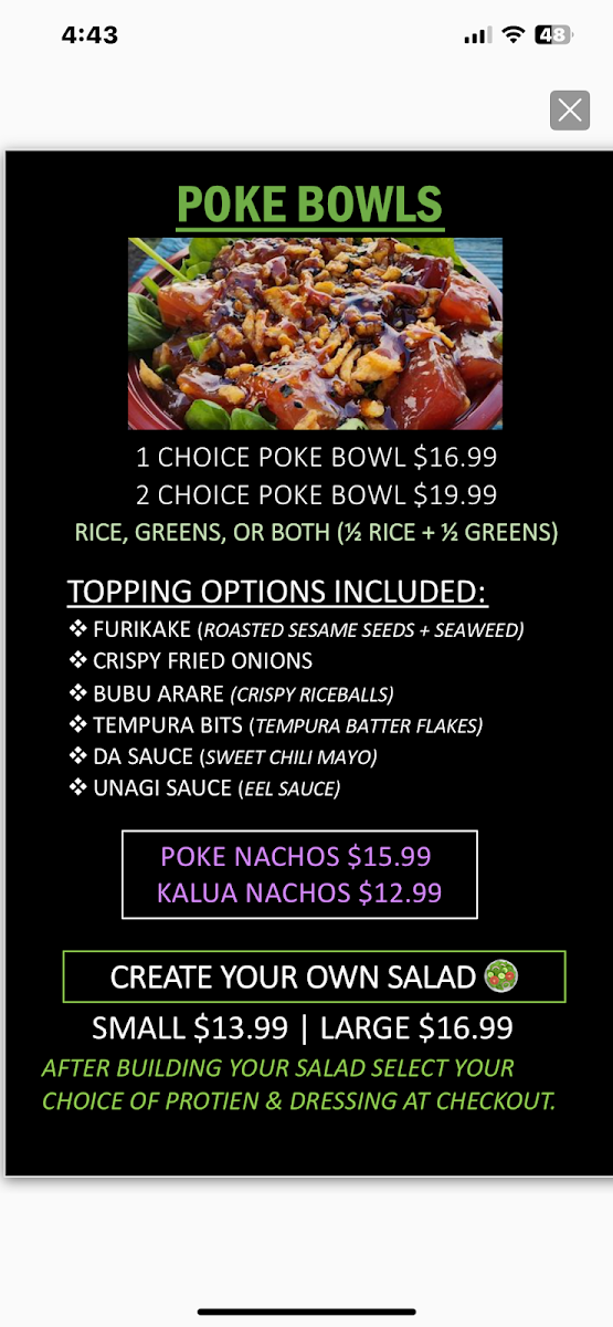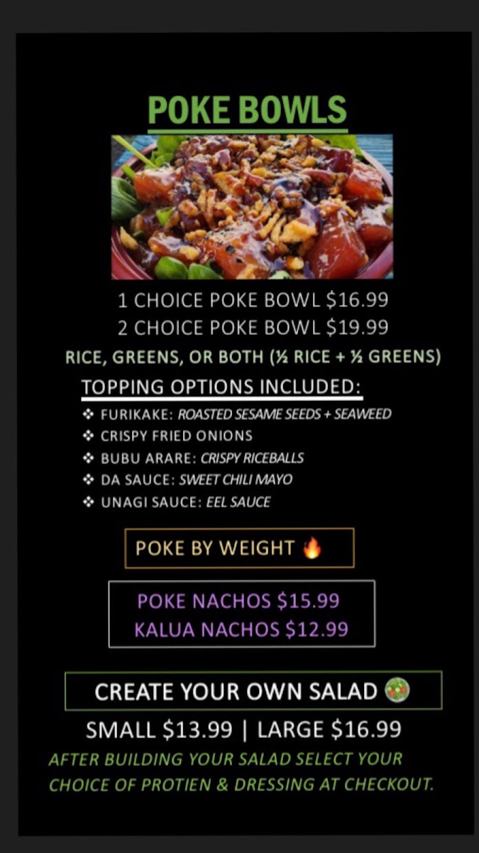 The menu features a variety of poke bowls showcasing unique and evolving flavors, often highlighting smoked fish and Hawaiian-inspired seafood combinations. Alongside poke, you can find hot dishes like fried chicken and salmon belly that complement the chilled selections, perfect for a filling lunch or a casual dinner.